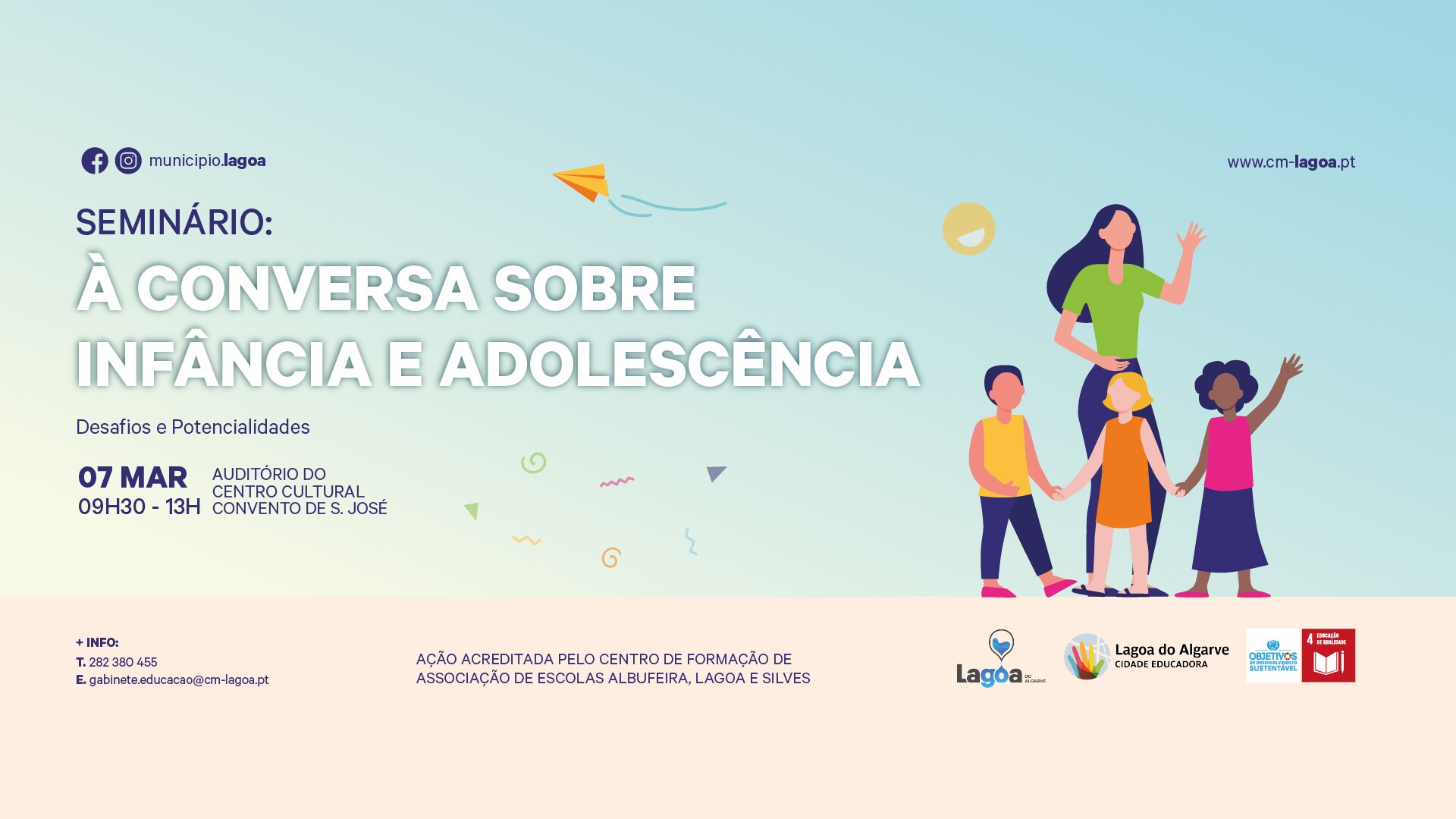 O auditório do Centro Cultural Convento de S. José, em Lagoa, recebe no dia 07 de março, entre as 09h30 e as 13h00, o seminário 👪À Conversa sobre Infância e Adolescência🚸, com o subtema Desafios e Potencialidades.