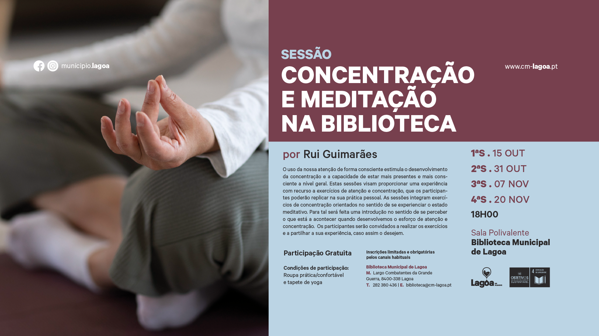 A Biblioteca Municipal de Lagoa recebe, entre outubro e novembro, pelas 18h00, quatro sessões de 🧘♀️Concentração e Meditação na Biblioteca📚 por Rui Guimarães e a participação é gratuita, mediante inscrição obrigatória através dos meios habituais.