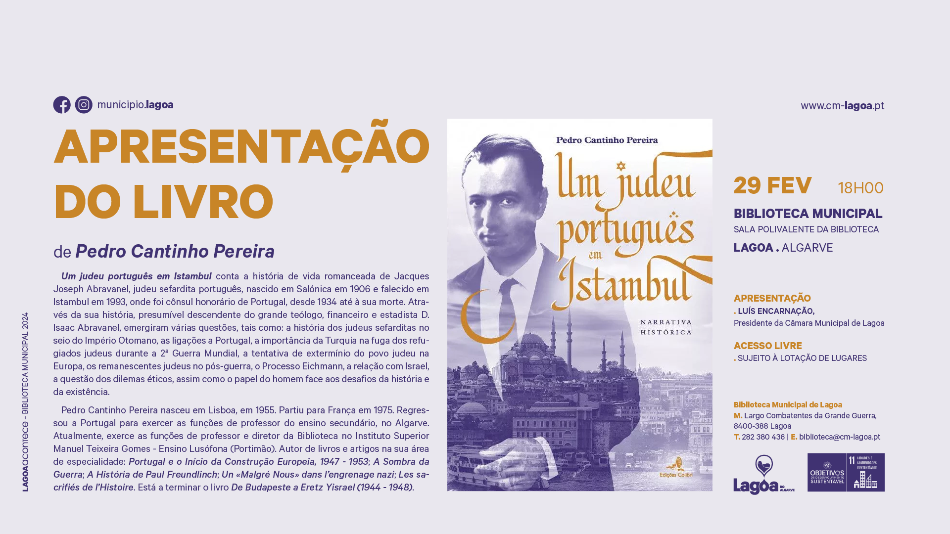 A Sala Polivalente da Biblioteca Municipal de Lagoa, recebe a Apresentação Pública do Livro Um judeu português em Istambul, de Pedro Cantinho Pereira, no próximo dia 29 de fevereiro, pelas 18h00 e a entrada é livre. A apresentação será realizada pelo Sr. Dr. Luís Encarnação, Presidente da Câmara Municipal de Lagoa.