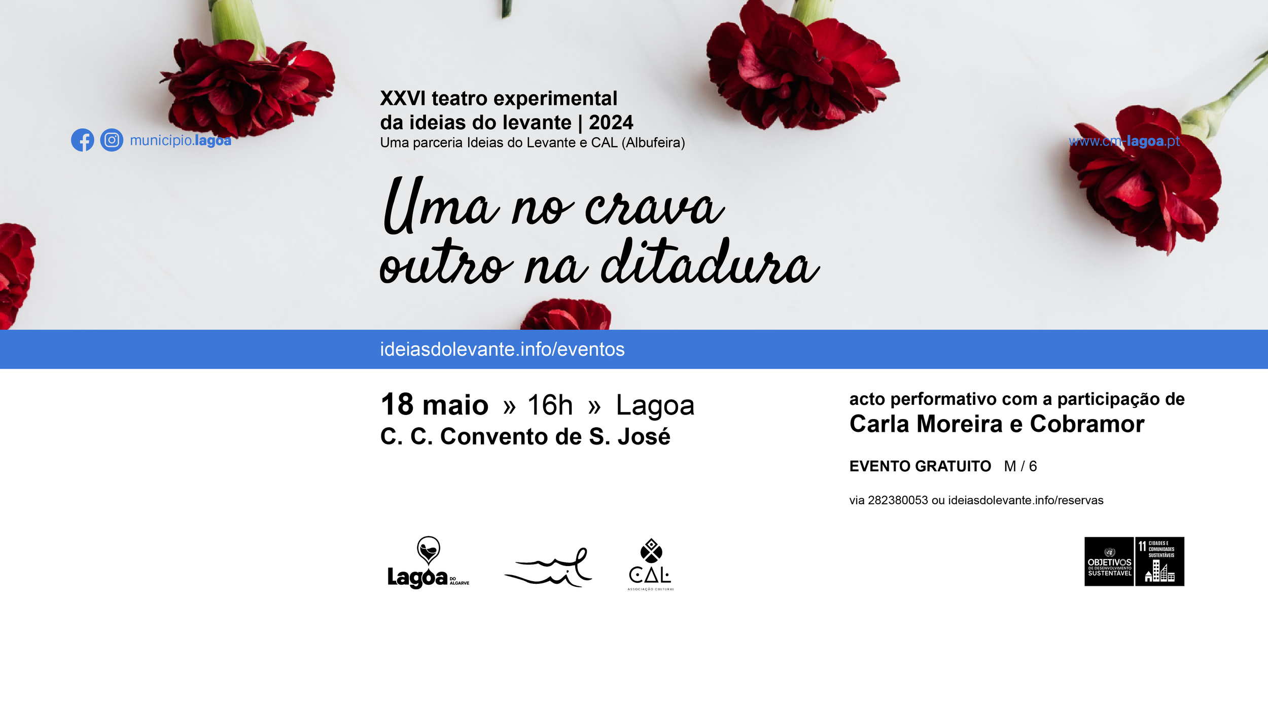 O Centro Cultural Convento de S. José, em Lagoa, recebe no dia 18 de maio, pelas 16h00, o espetáculo 🎭"Uma no crava outro na ditadura"✨, XXVI edição de Teatro Experimental, uma parceria Ideias do Levante e Cal (Albufeira).