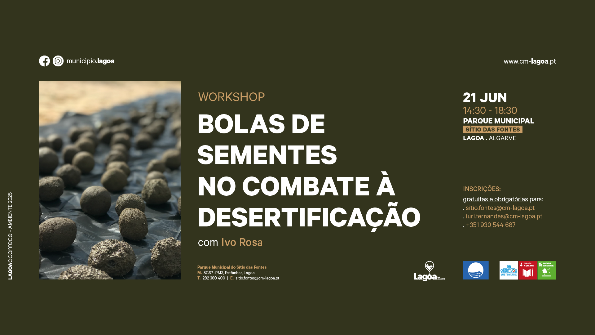 No próximo dia 21 de junho, o Parque Municipal do Sítio das Fontes, em Estômbar, recebe o 🌾Workshop Bolas de Sementes no combate à Desertificação🌱, com Ivo Rosa e a participação é gratuita.
