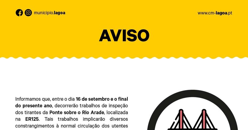 Informamos que, entre o dia 16 de setembro e o final do presente ano, decorrerão trabalhos de inspeção dos tirantes da Ponte ...Eventos | Página Inicial | Alertas