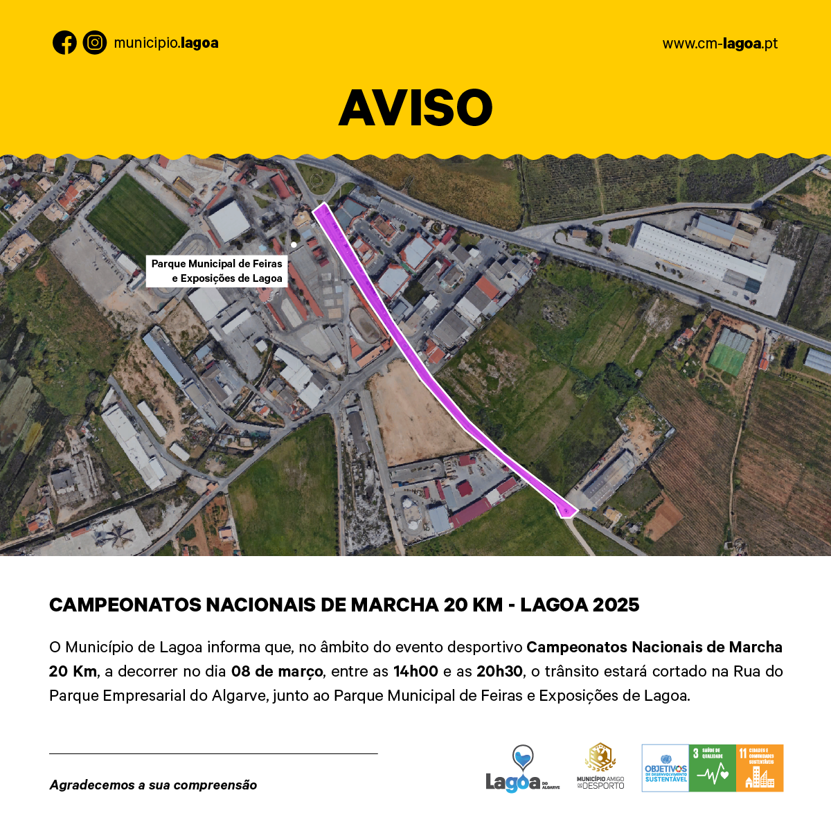 O Município de Lagoa informa que, no âmbito do evento desportivo Campeonatos Nacionais de Marcha 20 KM - Lagoa 2025, a decorria no dia 08 de março, entre as 14h00 e as 20h30, o trânsito estará cortado na Rua do Parque Empresarial do Algarve, junto ao Parque Municipal de Feiras e Exposições de Lagoa.