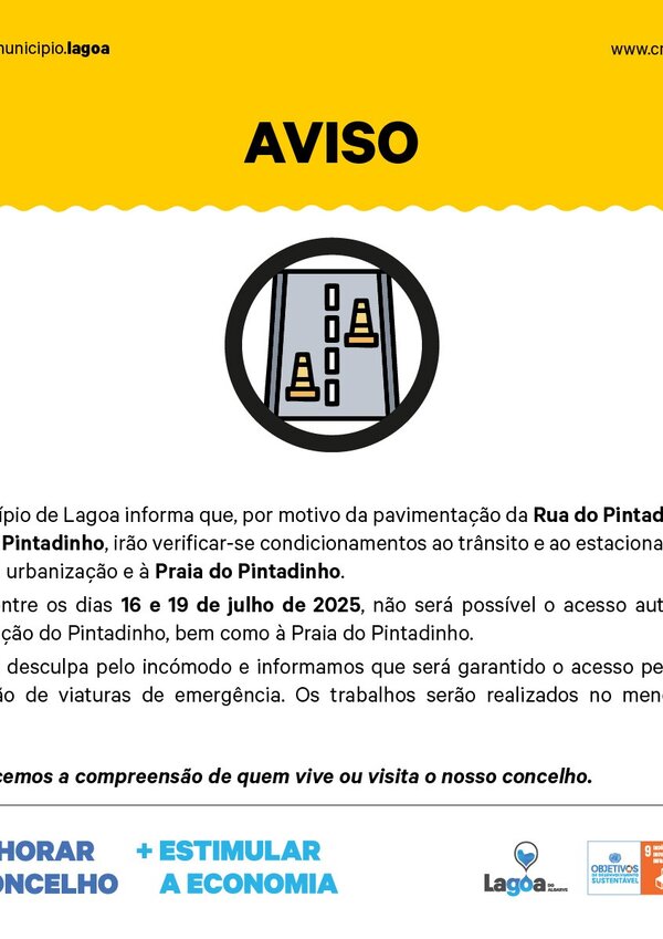 O Município de Lagoa informa que, a partir do dia 08 de outubro de 2025, a Rua da Liberdade, no Parchal, passará a ser de ...Eventos | Página Inicial | Alertas -