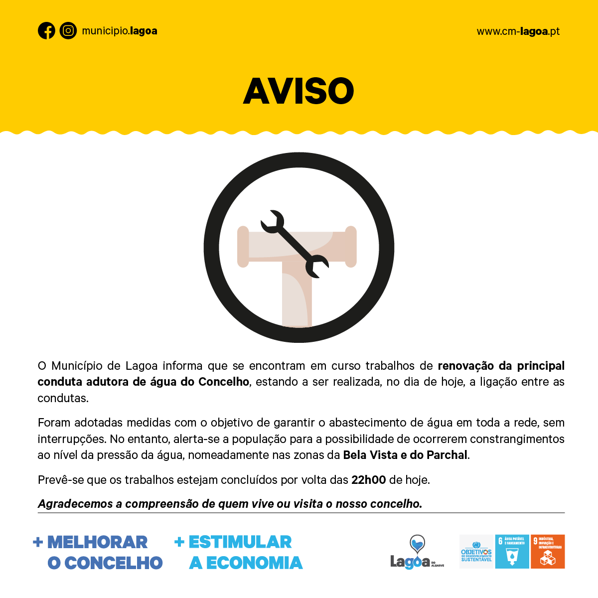 O Município de Lagoa informa que se encontram em curso trabalhos de renovação da principal conduta adutora de água do Concelho, estando a ser realizada, no dia de hoje, a ligação entre as condutas.