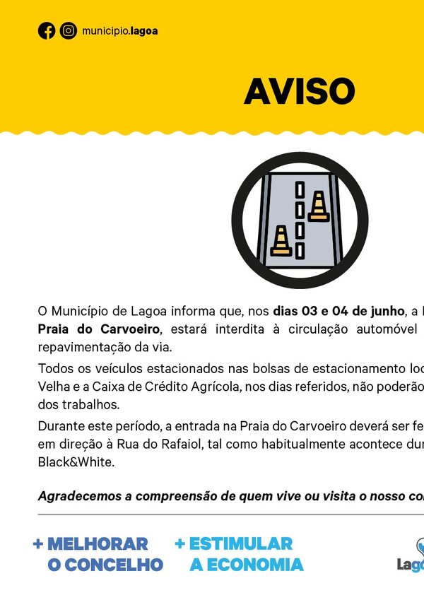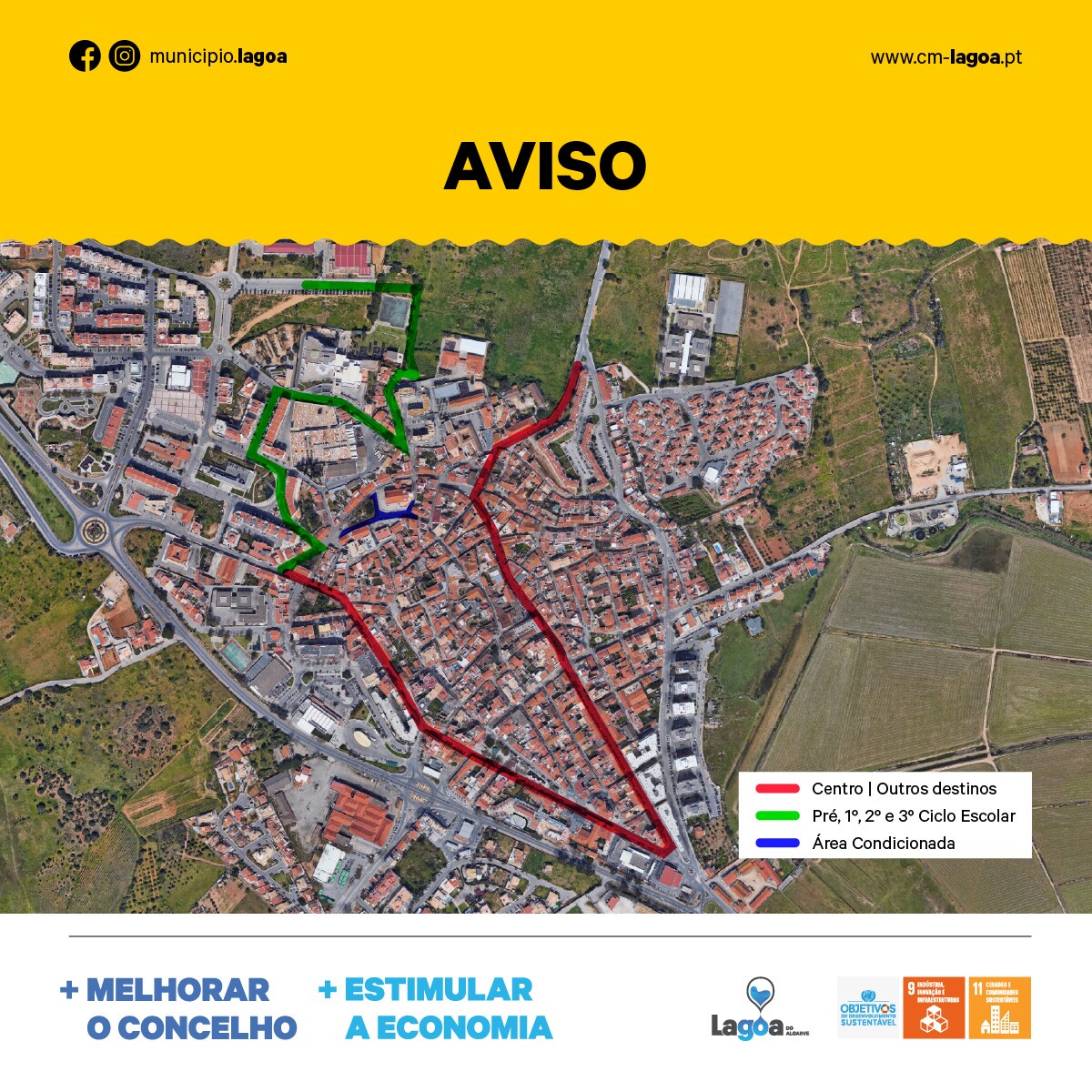 O Município de Lagoa informa que, no próximo dia 14 de maio de 2025, irá verificar-se o condicionamento do trânsito nas seguintes vias: Rua Almeida Garrett, Jardim dos Combatentes e Travessa Hintze Ribeiro, no âmbito da montagem de uma grua de obra da Empreitada de Construção de 7 Fogos de Habitação Acessível, situada na Rua Sebastião Trindade Pinto, n.º 9 a 13, em Lagoa.