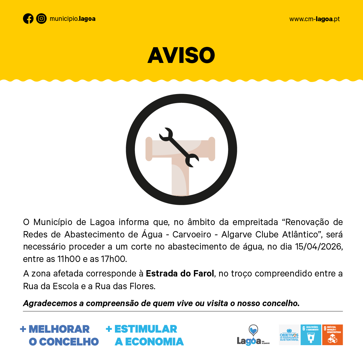 O Município de Lagoa informa que, no âmbito da empreitada “Renovação de Redes de Abastecimento de Água - Carvoeiro - Algarve Clube Atlântico”, será necessário proceder a um corte no abastecimento de água, no dia 15/04/2026, entre as 11h00 e as 17h00.