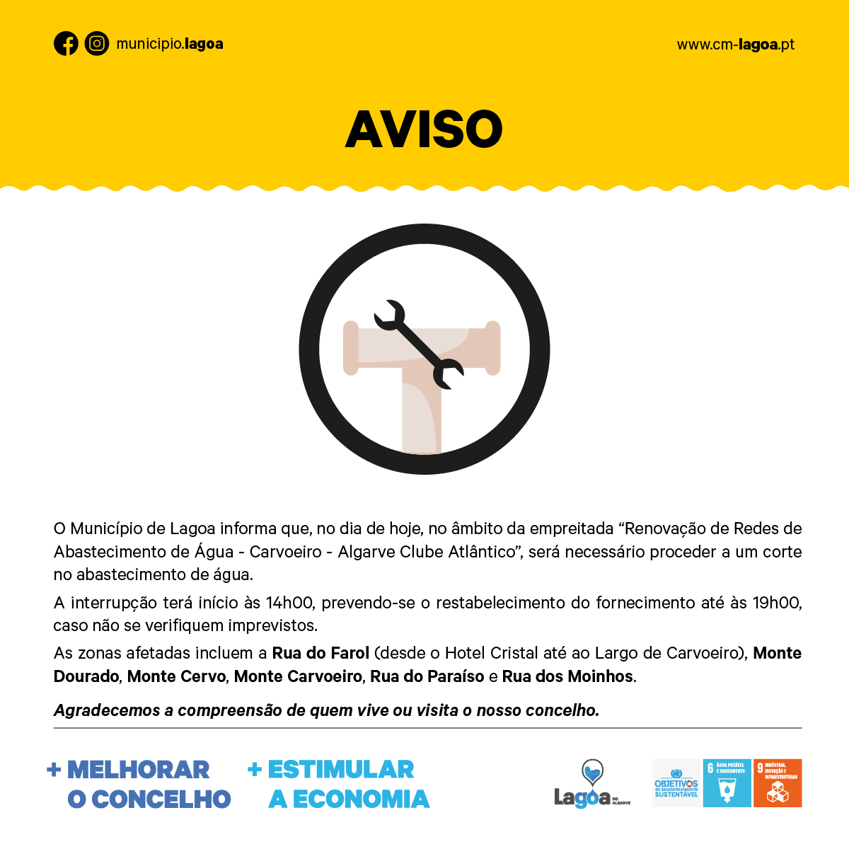 O Município de Lagoa informa que, no dia de hoje, no âmbito da empreitada “Renovação de Redes de Abastecimento de Água - Carvoeiro - Algarve Clube Atlântico”, será necessário proceder a um corte no abastecimento de água.