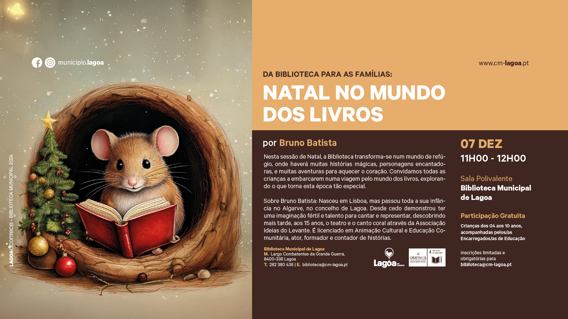 No dia 07 de dezembro, pelas 11h00, a Biblioteca Municipal de Lagoa, realiza uma sessão Especial de Natal da sua rubrica mensal 📖Da Biblioteca para as Famílias📚 intitulada: 🎄Natal no Mundo dos Livros🎅, por Bruno Batista.