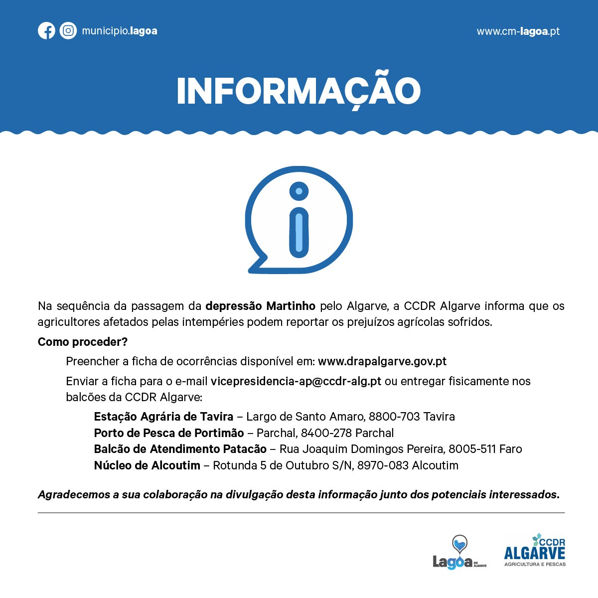 Na sequência da passagem da depressão Martinho pelo Algarve, a CCDR Algarve informa que os agricultores afetados pelas intempéries podem reportar os prejuízos agrícolas sofridos.