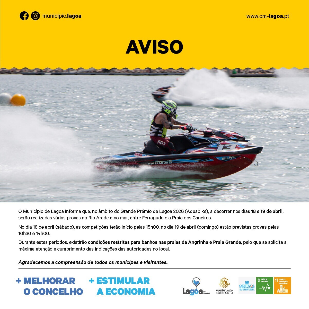 O Município de Lagoa informa que, no âmbito do Grande Prémio de Lagoa 2026 (Aquabike), a decorrer nos dias 18 e 19 de abril, serão realizadas várias provas no Rio Arade e no mar, entre Ferragudo e a Praia dos Caneiros.