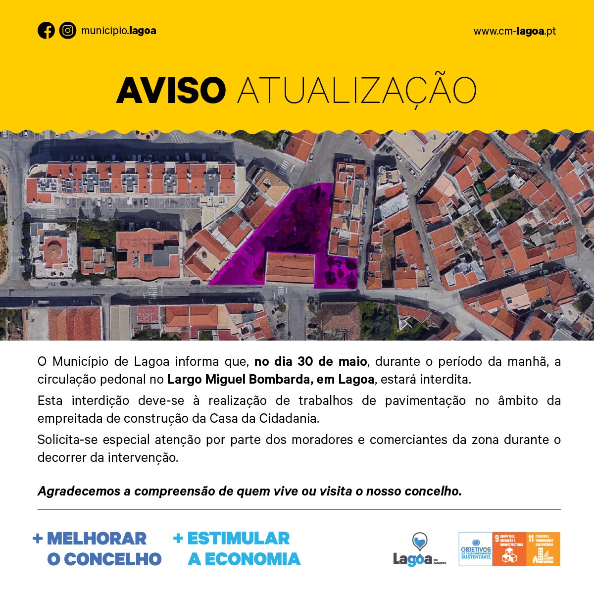 O Município de Lagoa informa que, no dia 30 de maio, durante o período da manhã, a circulação pedonal no Largo Miguel Bombarda, em Lagoa, estará interdita.