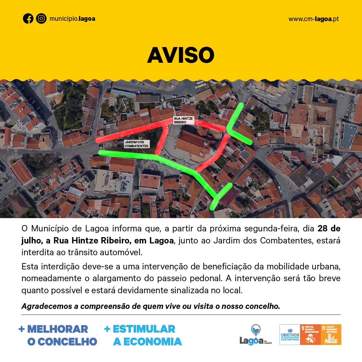 O Município de Lagoa informa que, a partir da próxima segunda-feira, dia 28 de julho, a Rua Hintze Ribeiro, em Lagoa, junto ao Jardim dos Combatentes, estará interdita ao trânsito automóvel.