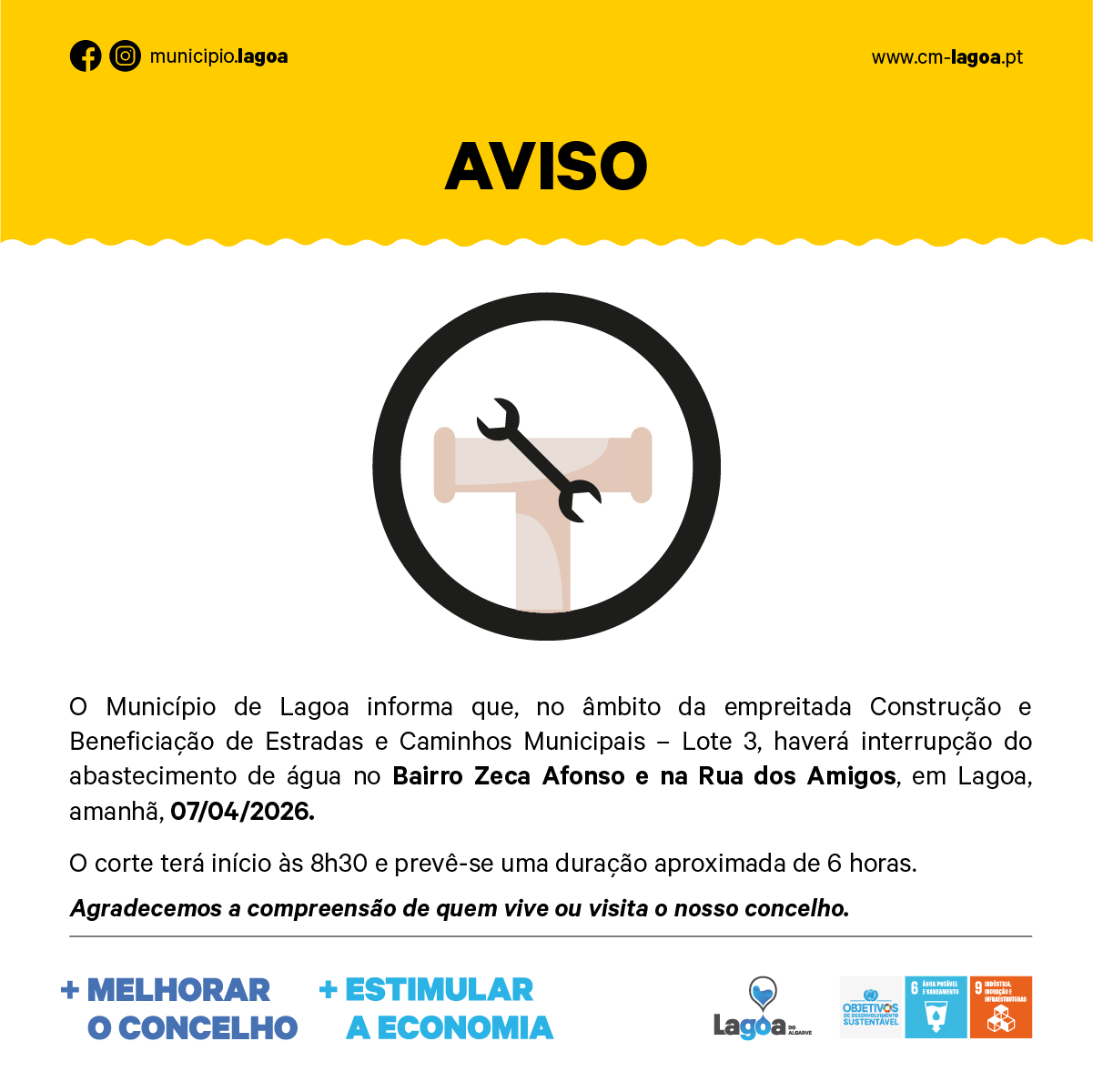 O Município de Lagoa informa que, no âmbito da empreitada Construção e Beneficiação de Estradas e Caminhos Municipais – Lote 3, haverá interrupção do abastecimento de água no Bairro Zeca Afonso e na Rua dos Amigos, em Lagoa, amanhã, 07/04/2026.