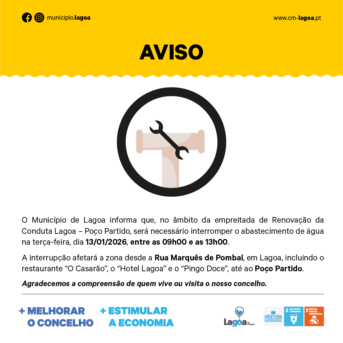 O Município de Lagoa informa que, no âmbito da empreitada de Renovação da Conduta Lagoa – Poço Partido, será necessário interromper o abastecimento de água na terça-feira, dia 14/01/2026, entre as 09h00 e as 13h00.