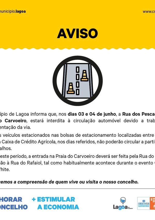 O Município de Lagoa informa que, no dia 28 de outubro, terá início, na Rua Sá Carneiro, em Lagoa, a empreitada de ...Eventos | Página Inicial | Alertas -