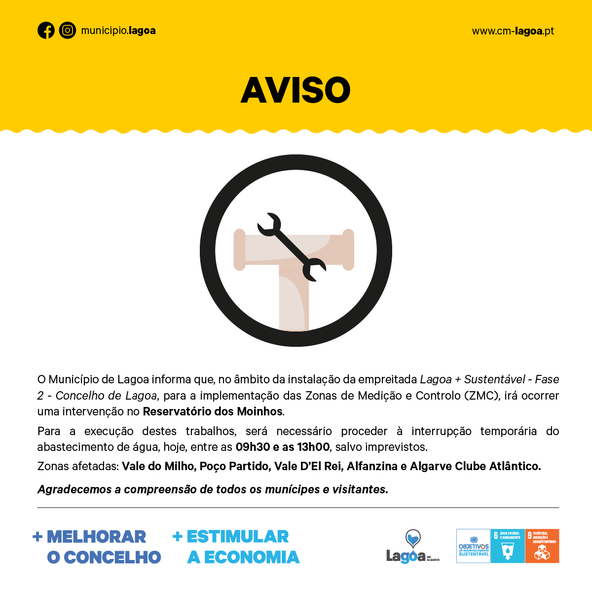 O Município de Lagoa informa que, no âmbito da instalação da empreitada “Lagoa + sustentável – Fase 2 – Concelho de Lagoa”, para a implementação das Zonas de Medição e Controlo (ZMC), uma intervenção no Reservatório dos Moinhos.