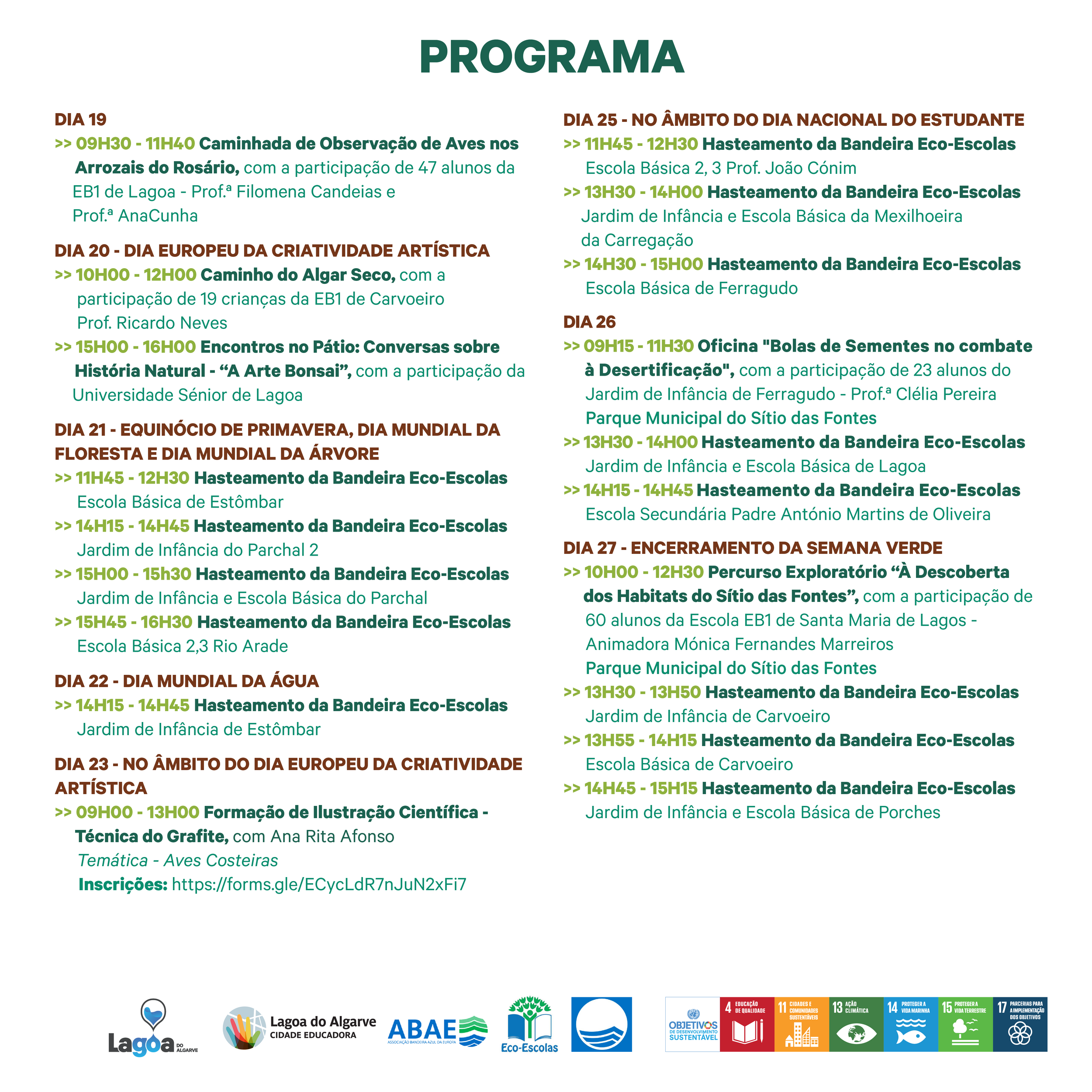 Serão celebrados, durante a Semana Verde, o Dia Europeu da Criatividade Artística (20 de março), o Equinócio de Primavera e Dia Internacional das Florestas ou da Árvore (21 de março), o Dia Mundial da Água (22 de março), Dia Mundial da Meteorologia (23 de março) e Dia Nacional do Estudante (24 de março), com atividades de educação ambiental para a comunidade escolar e uma atividade de formação para o público em geral.