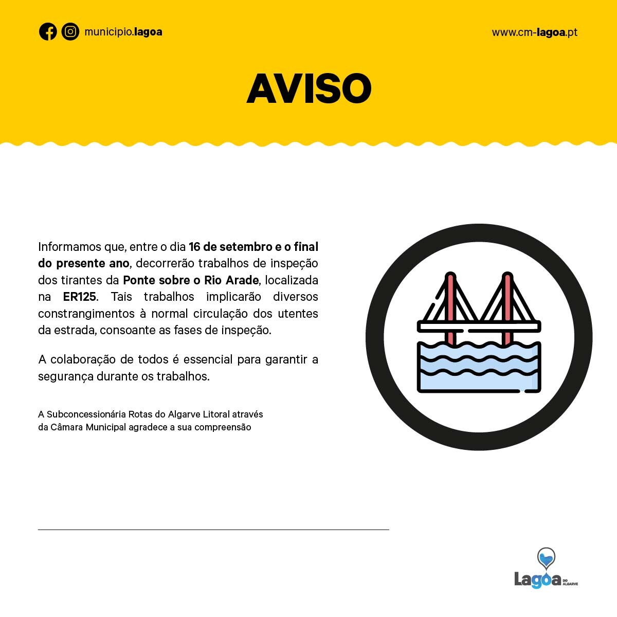 Informamos que, entre o dia 16 de setembro e o final do presente ano, decorrerão trabalhos de inspeção dos tirantes da Ponte sobre o Rio Arade, localizada na ER125.