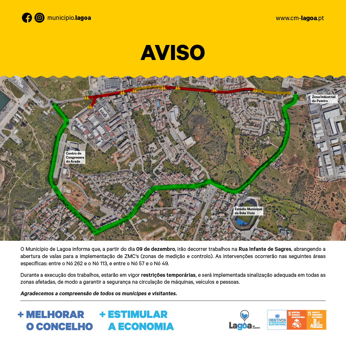 O Município de Lagoa informa que, a partir do dia 09 de dezembro, irão decorrer trabalhos na Rua Infante de Sagres, abrangendo a abertura de valas para a implementação de ZMC's (zonas de medição e controlo). As intervenções ocorrerão nas seguintes áreas específicas: entre o Nó 262 e o Nó 113, e entre o Nó 57 e o Nó 49.
