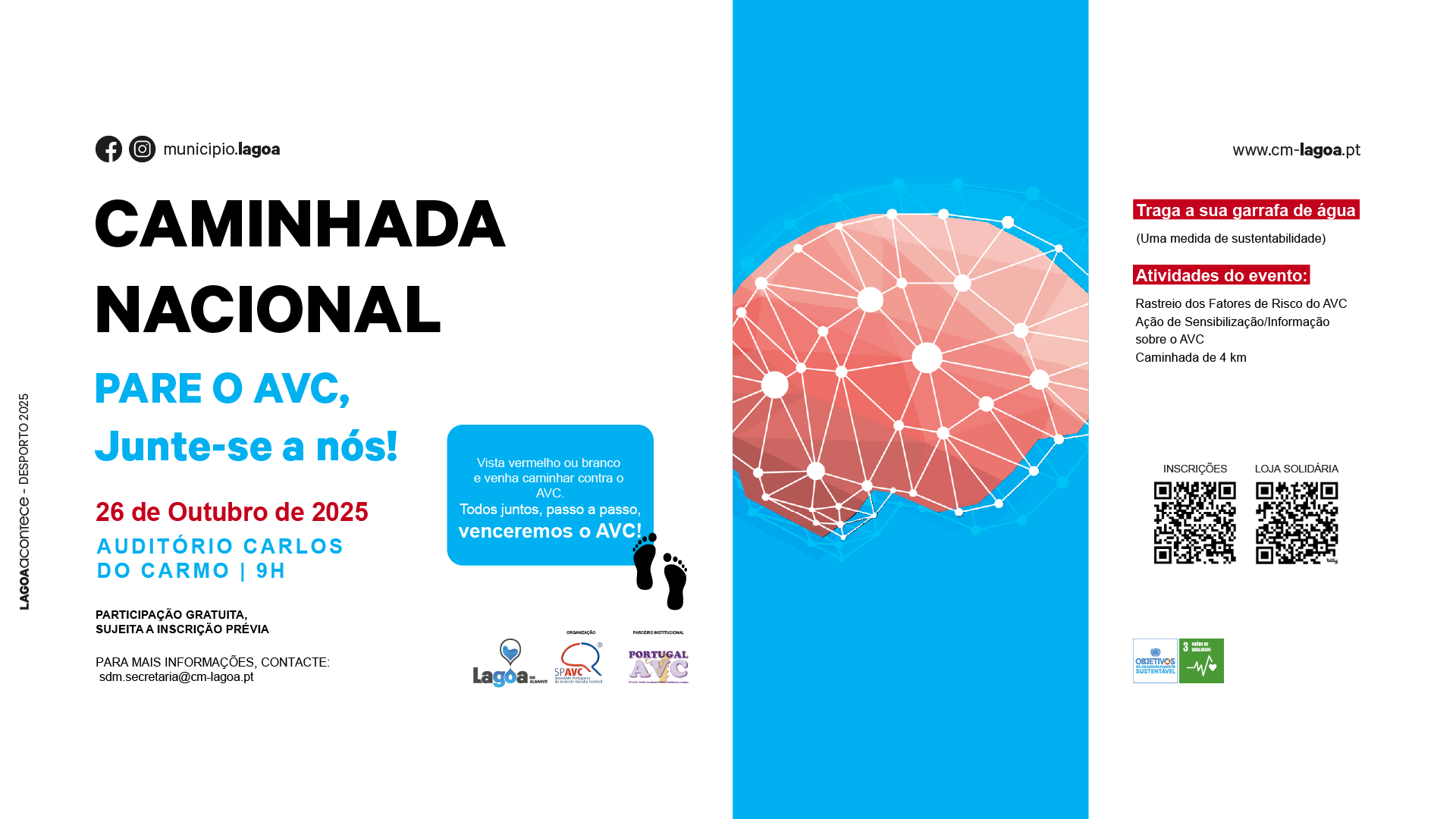 Com o intuito de sensibilizar para uma das principais causas de morte e também de incapacidade física e mental, o Município de Lagoa junta-se à Sociedade Portuguesa do Acidente Vascular Cerebral para assinalar o Dia Mundial do AVC através da campanha 🛑Pare o AVC, junte-se a nós🧠.