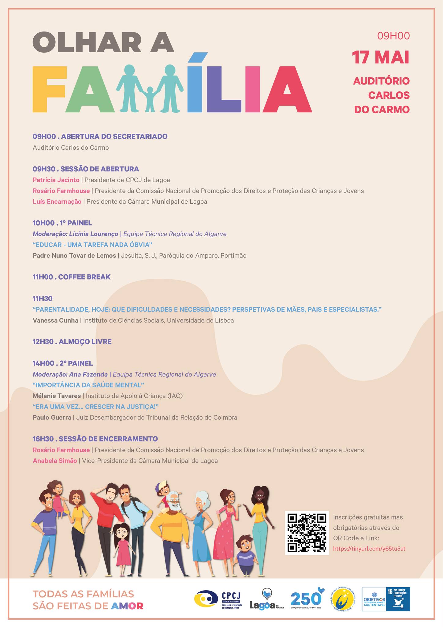 Pelo impacto e importância que as famílias têm nas crianças e nos jovens, a Comissão de Proteção de Crianças e Jovens de Lagoa, em estreita articulação com o Município de Lagoa, lança o repto de se comemorar o mês de maio, enquanto mês da família, através da realização de um encontro que prevê “Olhar a Família” sobre questões prementes para as mesmas, bem como, para quem junto destas intervém.