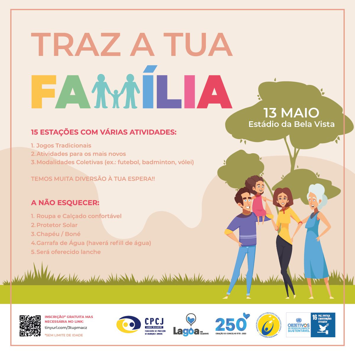 Pelo impacto e importância que as famílias têm nas crianças e nos jovens, a Comissão de Proteção de Crianças e Jovens de Lagoa, em estreita articulação com o Município de Lagoa, lança o repto de se comemorar o mês de maio, enquanto mês da família, através da participação numa iniciativa pensada para trazê-las ao Estádio Municipal da Bela Vista, a fim de poderem desfrutar de uma manhã diferente em família.