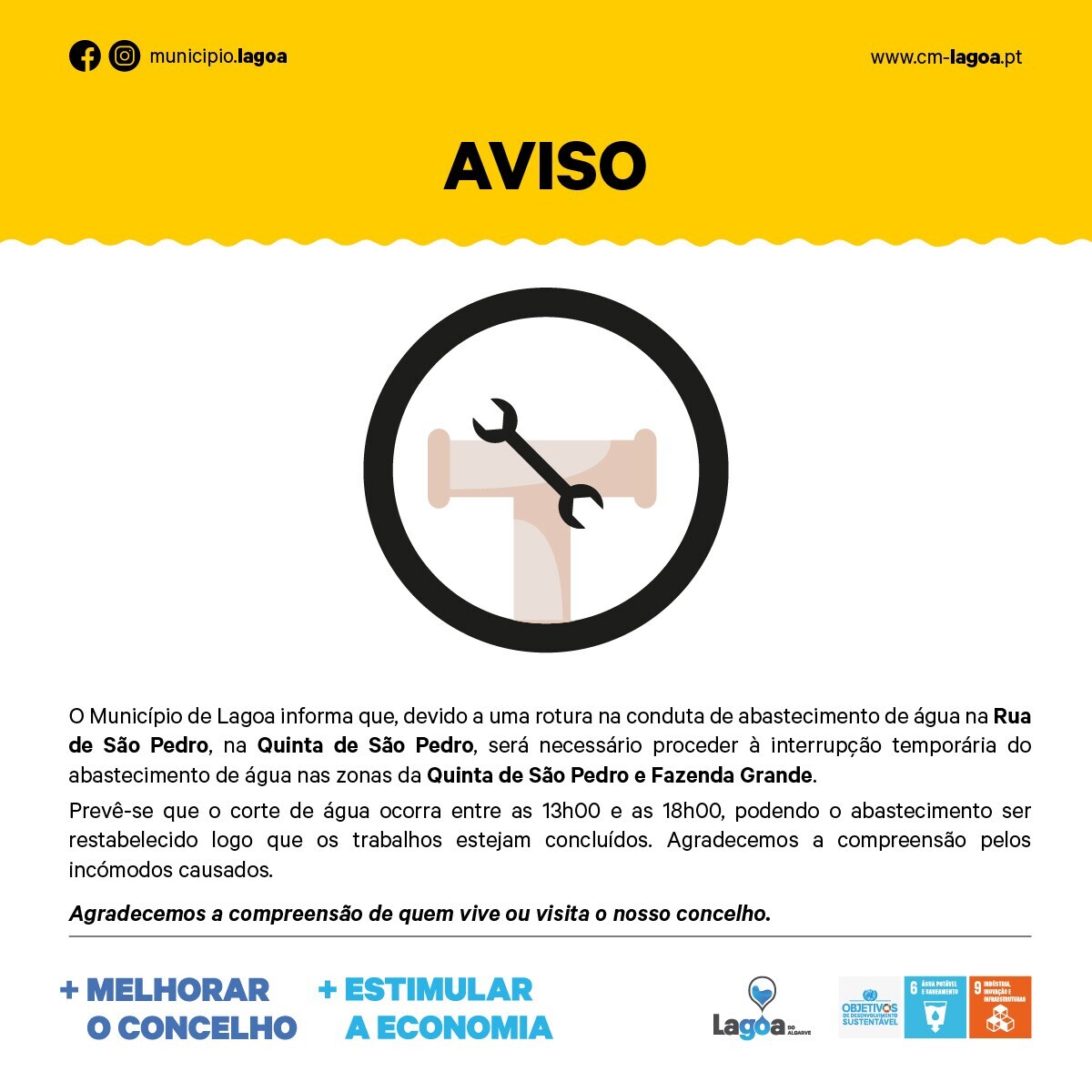 O Município de Lagoa informa que, devido a uma rotura na conduta de abastecimento de água na Rua de São Pedro, na Quinta de São Pedro, será necessário proceder à interrupção temporária do abastecimento de água nas zonas da Quinta de São Pedro e Fazenda Grande.