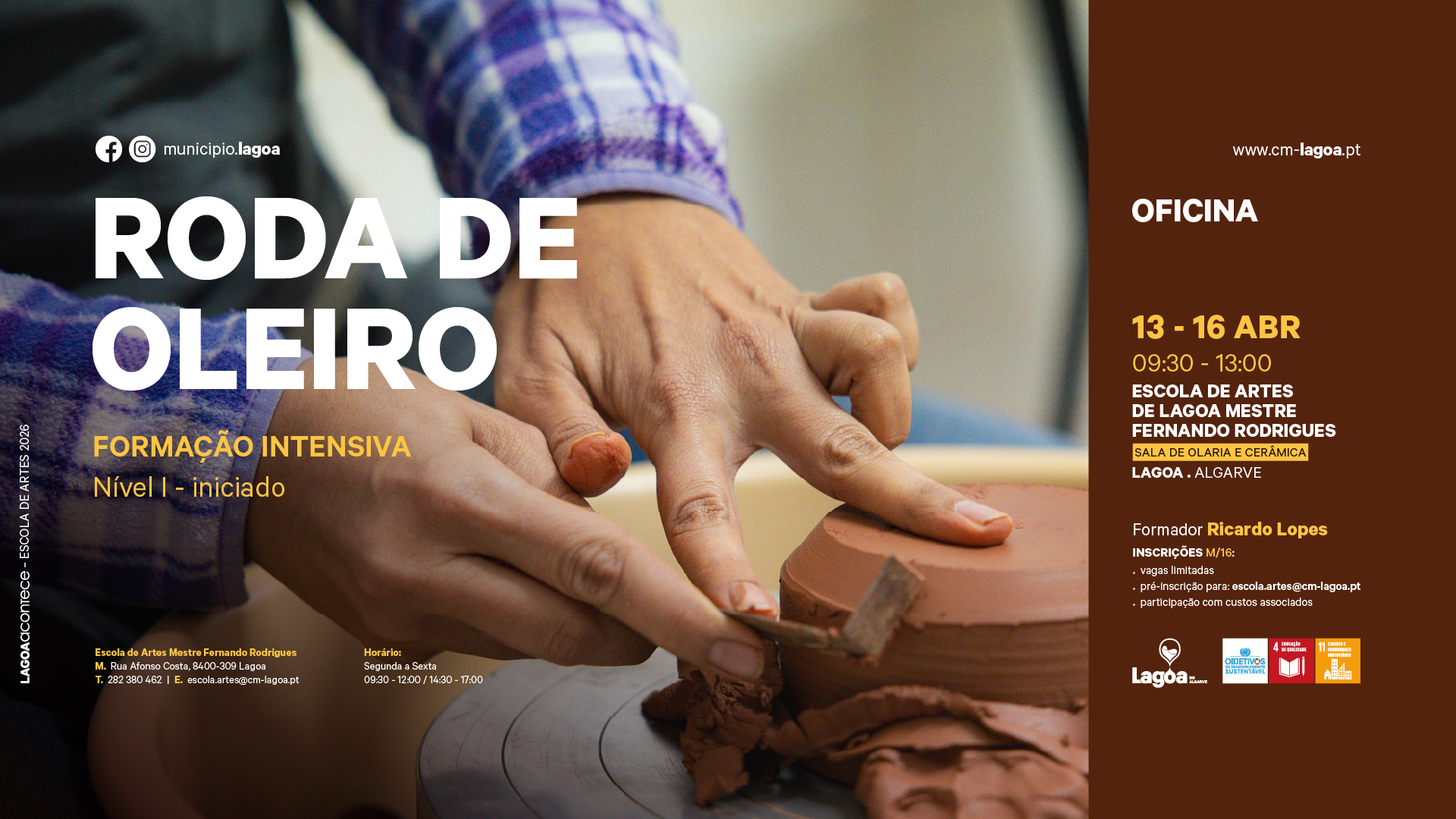Durante as sessões, os formandos terão a oportunidade de conhecer os princípios fundamentais da conformação do barro na roda de oleiro, explorando as várias etapas do processo — da preparação e modelação ao acabamento — num ambiente de aprendizagem prática e criativa.