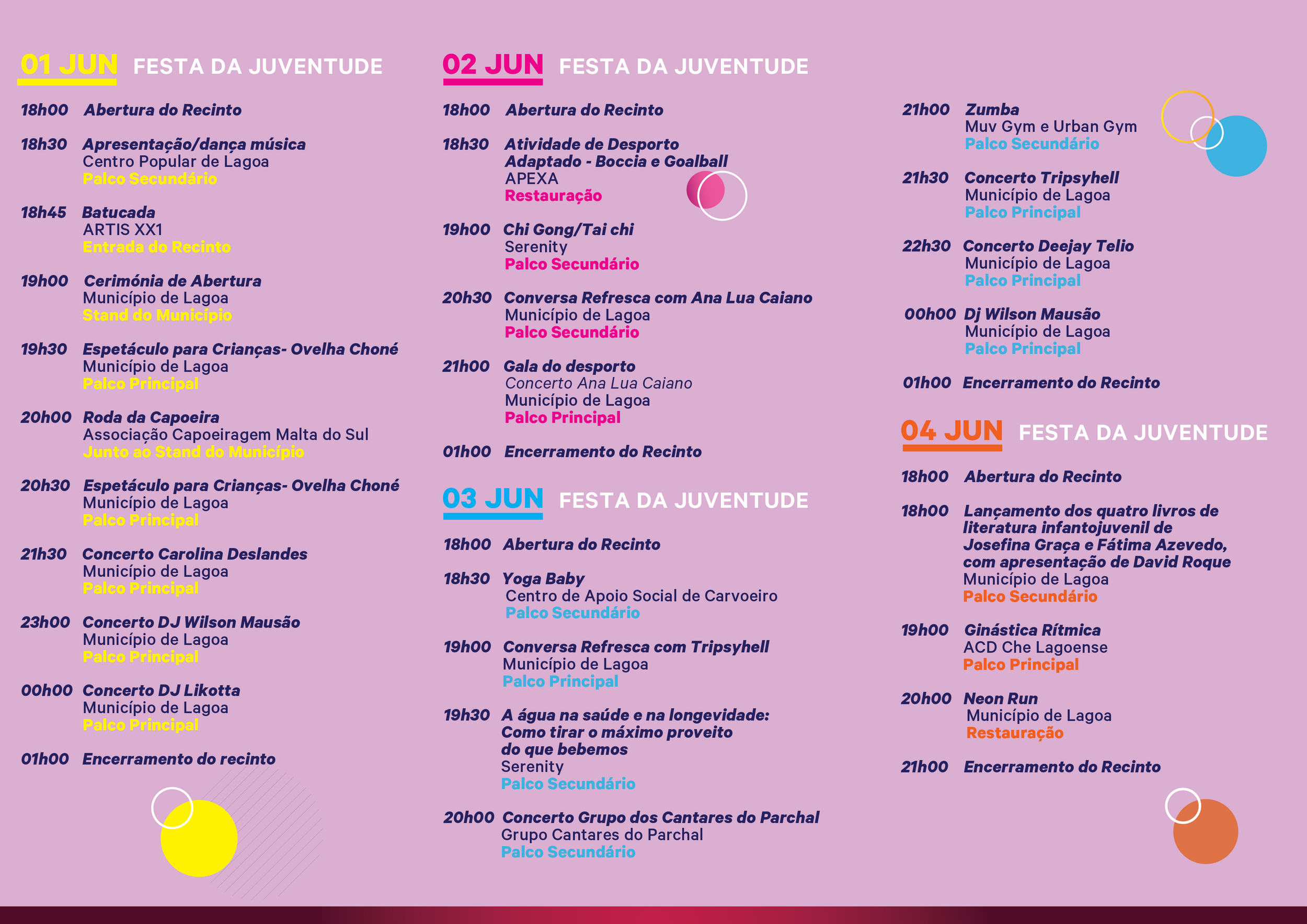 Entre espetáculos dinamizados pelas IPSS´s do concelho, Yoga para bebés, espetáculo da “Ovelha Choné, Zumba, conversas sobre temas da atualidade, Dj´s, concertos imperdíveis, ginástica rítmica, lançamento de livros, capoeira e muita animação, não faltarão motivos para visitar e participar na 2ª Edição da Festa da Juventude de Lagoa.