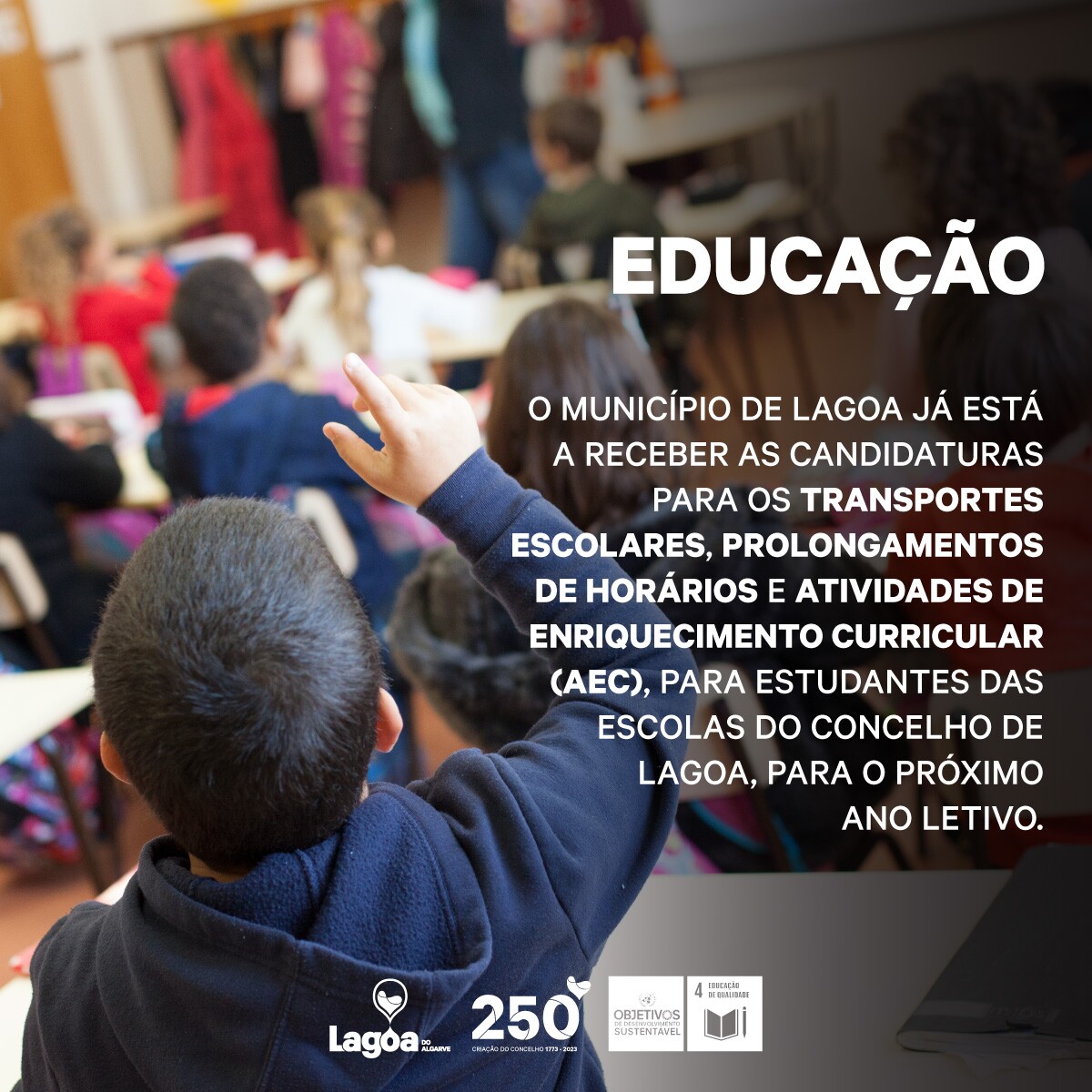 O Município de Lagoa já está a receber as candidaturas para os transportes escolares, prolongamentos de horários e Atividades de Enriquecimento Curricular (AEC), para estudantes das escolas do concelho de Lagoa, para o próximo ano letivo.