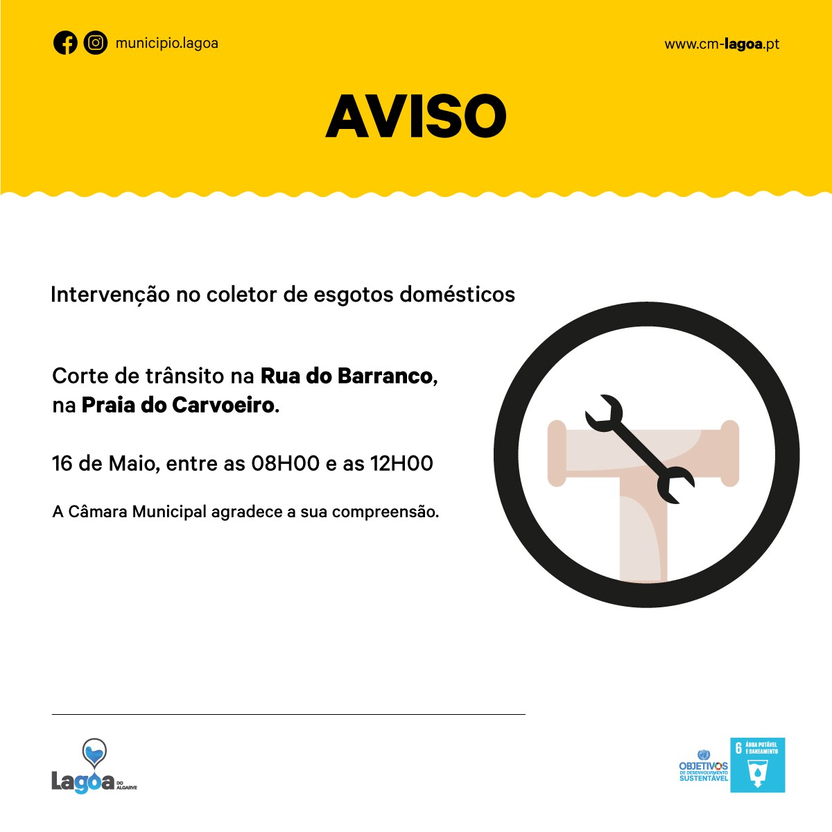 O Município de Lagoa informa que, face à necessidade de intervenção no coletor de esgotos domésticos, será necessário proceder ao corte de trânsito temporário, na Rua do Barranco, na Praia do Carvoeiro, no próximo dia 16 de maio.