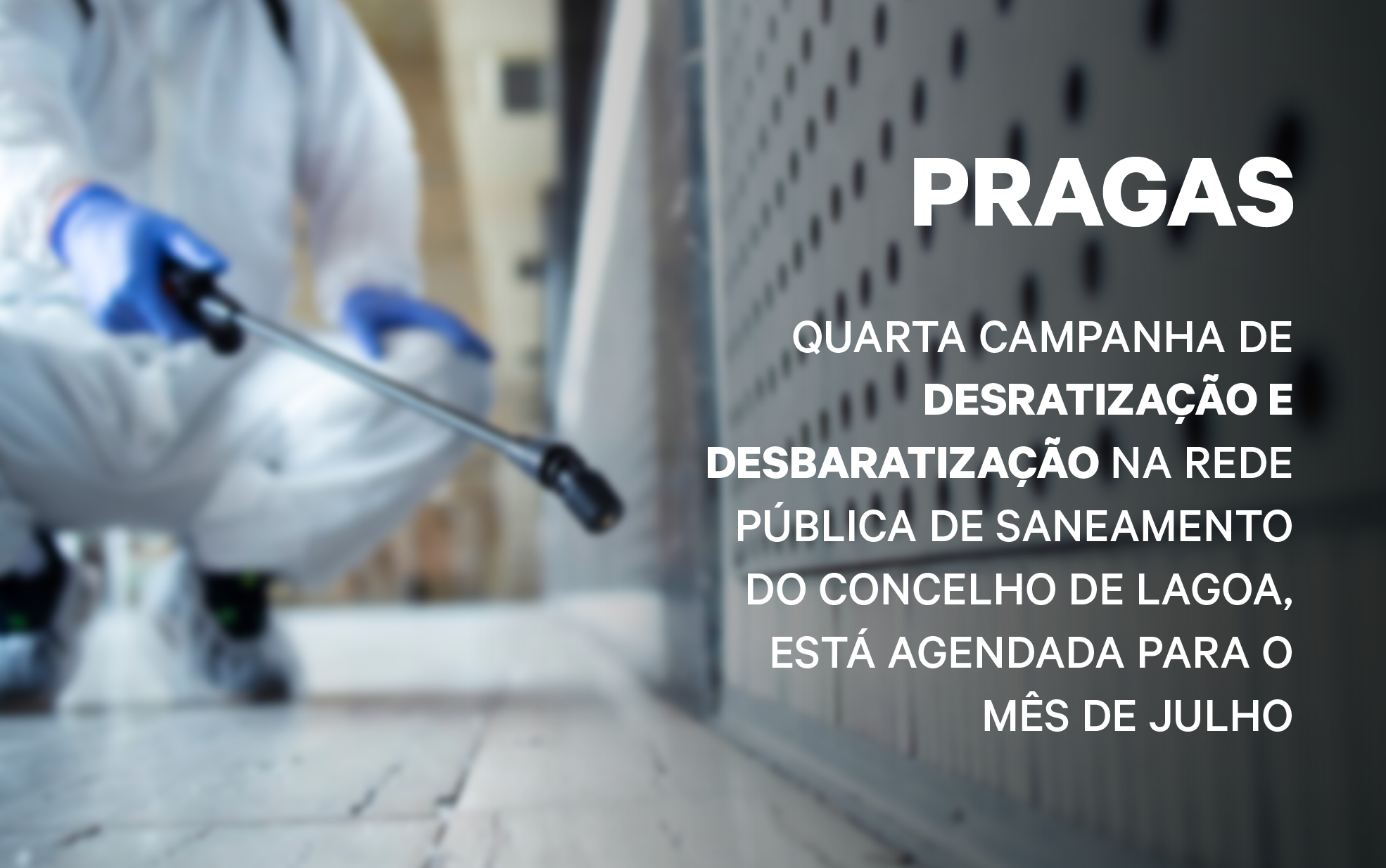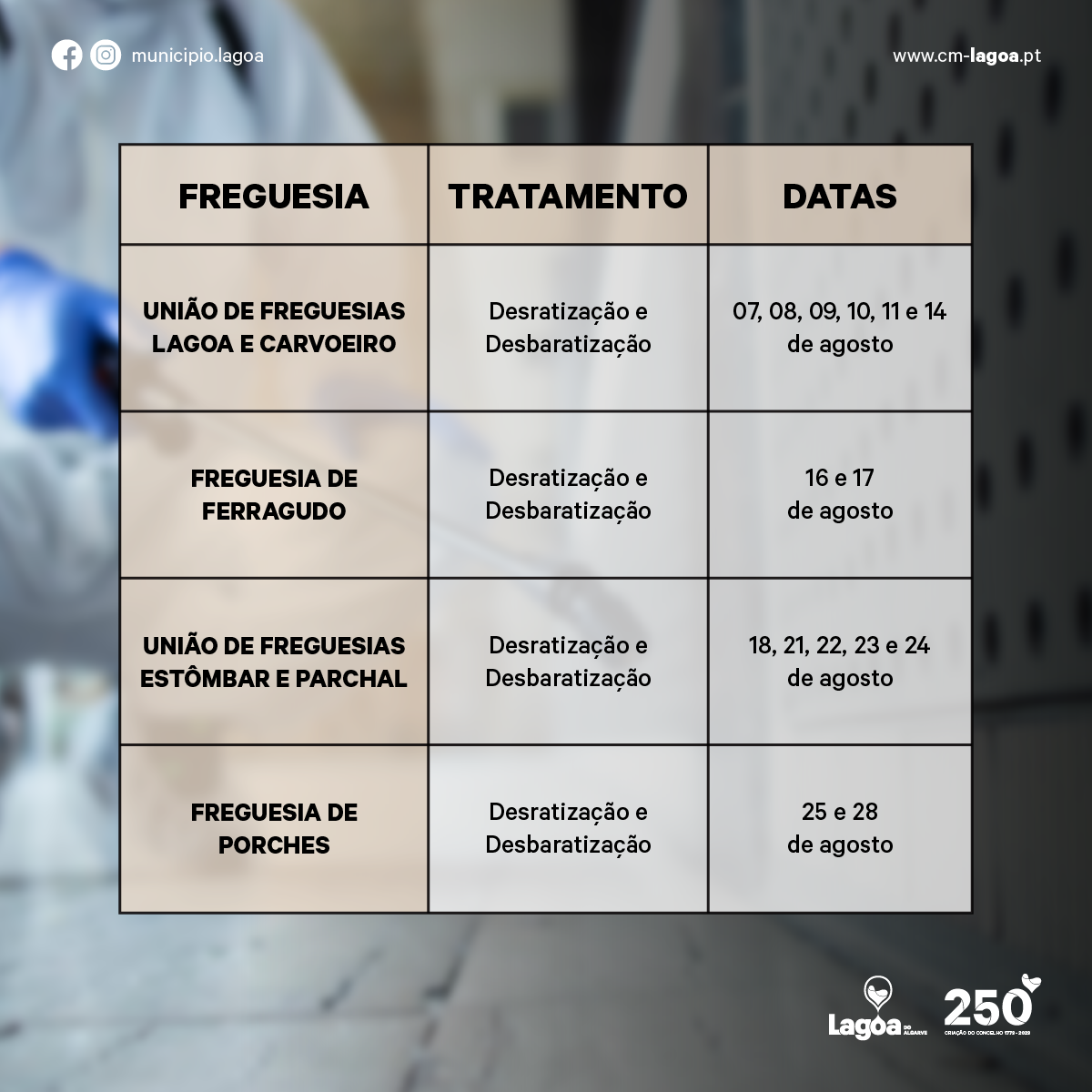 A quinta campanha de desratização e desbaratização na rede pública de saneamento do concelho de Lagoa, está agendada para o mês de agosto, conforme cronograma abaixo indicado: