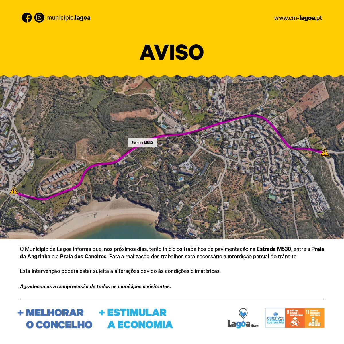 O Município de Lagoa informa que, nos próximos dias, terão início os trabalhos de pavimentação em Ferragudo, na Estrada M530, entre a Praia da Angrinha e a Praia dos Caneiros. Para a realização dos trabalhos será necessário a interdição parcial do trânsito.