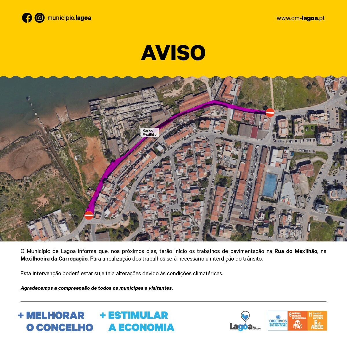 O Município de Lagoa informa que, nos próximos dias, os trabalhos de pavimentação na Mexilhoeira da Carregação, na Rua do Mexilhão. Para a realização dos trabalhos será necessário a interdição do trânsito.